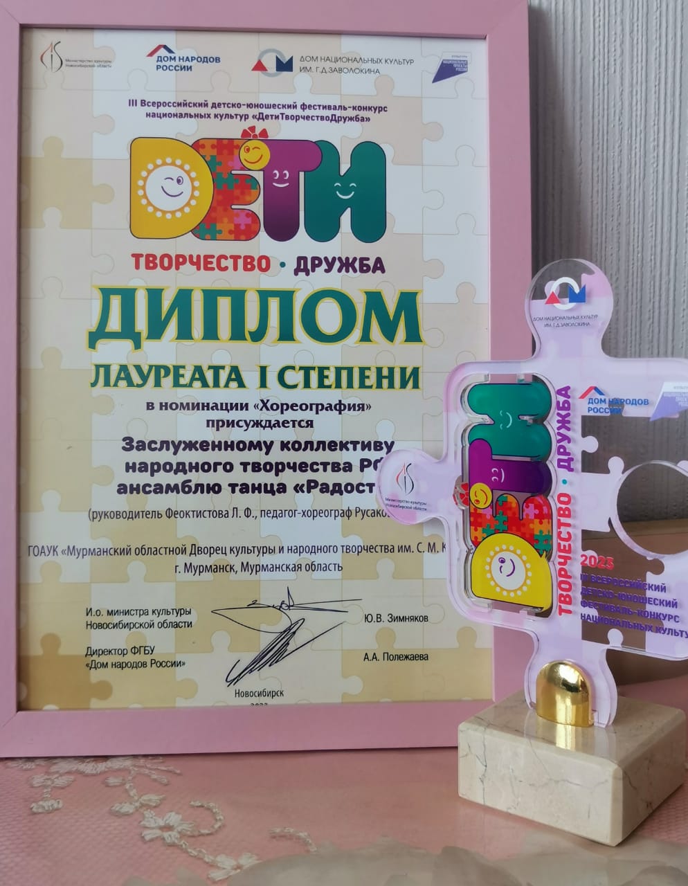 В Новосибирске с 10 по 12 июня состоялся III Всероссийский детско-юношеский фестиваль-конкурс национальных культур «#ДетиТворчествоДружба». Масштабный межнациональный проект прошёл в рамках национального проекта «Культура» и объединил лучшие творческие коллективы из разных регионов России. Мурманскую область достойно представила средняя группа Заслуженного коллектива народного творчества ансамбля танца «Радость». В номинации «Хореография» юные танцоры стали обладателями диплома Лауреата I степени, исполнив номер «Игралица». В мероприятиях Фестиваля-конкурса #ДетиТворчествоДружба приняли участие 135 творческих коллективов, а это свыше 1400 человек из Забайкальского края, Красноярского края, Тюменской, Иркутской, Мурманской, Воронежской, Кемеровской, Новосибирской областей, Республик Бурятии, Хакасии, Ханты-Мансийского автономного округа и г. Санкт-Петербург. Каждый из участников отобразил культуру своих народов: обычаи, обряды, национальные танцы и песни. Поздравляем художественного руководителя Ларису Федоровну Феоктистову, балетмейстера Наталью Викторовну Русакову и ансамбль танца «Радость» с заслуженной наградой!