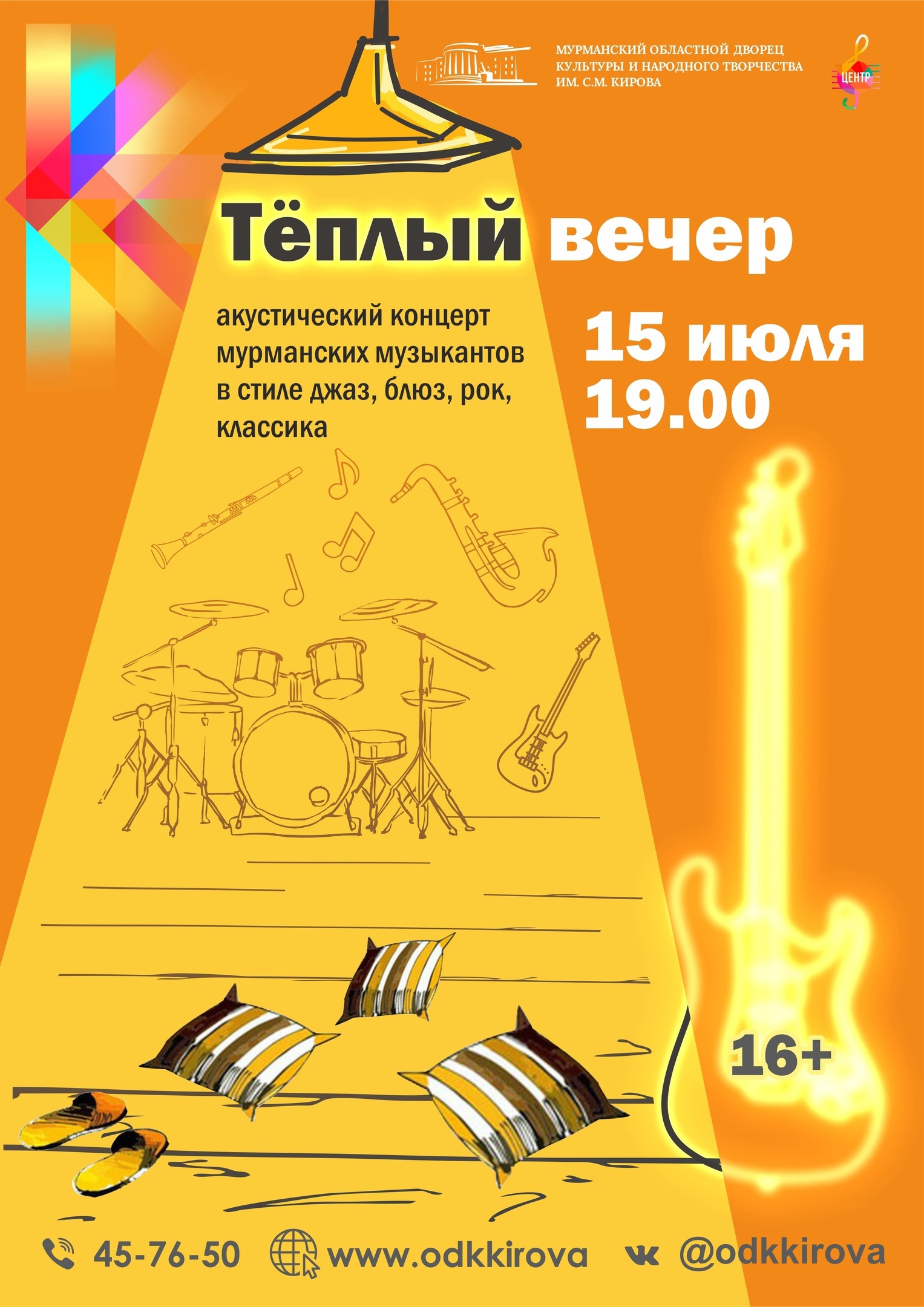 Дорогие друзья! Приглашаем всех любителей музыки на акустический концерт мурманских музыкантов. Различные группы и отдельные исполнители сыграют для вас в музыкальные композиции в стиле джаз, блюз, рок, классика. Ждем вас в "Кировке" 15 июля в 19.00 Вход свободный.