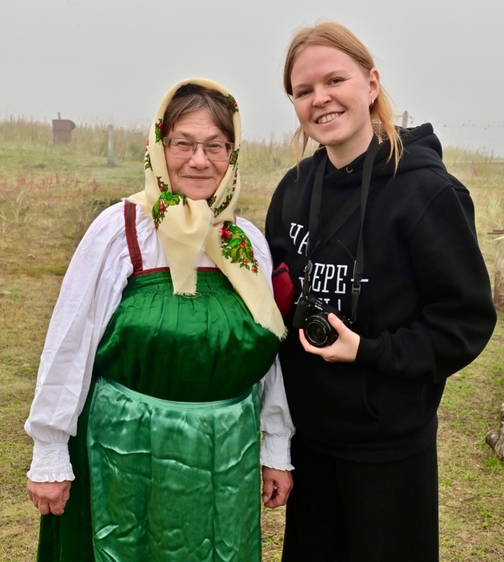 В завершение первого экспедиционного дня была проведена видеофиксация процесса надевания традиционного поморского головного убора в исполнении участниц народного самодеятельного коллектива фольклорного ансамбля «Беломорье» и хормейстера коллектива Черновой Татьяны Васильевны. По итогам двух экспедиций собранные материалы рассмотрят для включения в федеральный и региональный реестры нематериального этнокультурного достояния