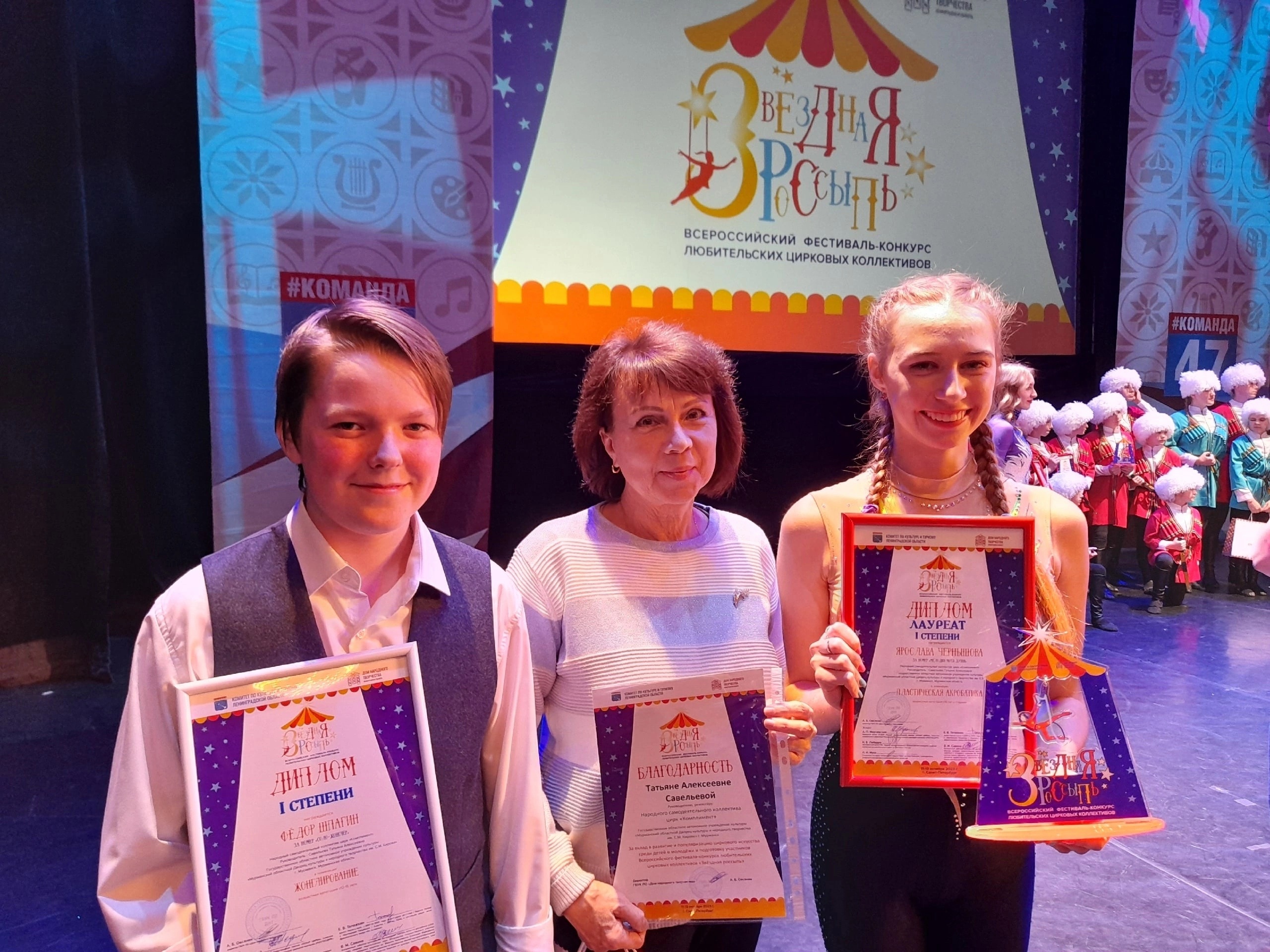 11-13 октября в Санкт - Петербурге прошел Всероссийский фестиваль-конкурс любительских цирковых коллективов "Звездная россыпь". В нем приняли участие 37 лучших коллективов со всех регионов России. Профессиональному жюри пришлось просмотреть 116 конкурсных номеров!Юные артисты из цирка "Комплимент" достойно представили Мурманскую область на этом цирковом конкурсе. Лауреатом 1 степени в номинации "Пластическая акробатика" стала Ярослава Чернышова с номером "Мелодия моей души". Дипломом 1 степени был награжден Федор Шпагин за номер "Соло жонглер". От всей души поздравляем руководителя коллектива Савельеву Татьяну Алексеевну и наших талантливых юных цирковых артистов! Заслуженные награды по праву ваши! Желаем новых творческих побед и успехов!