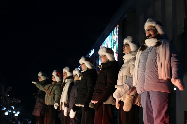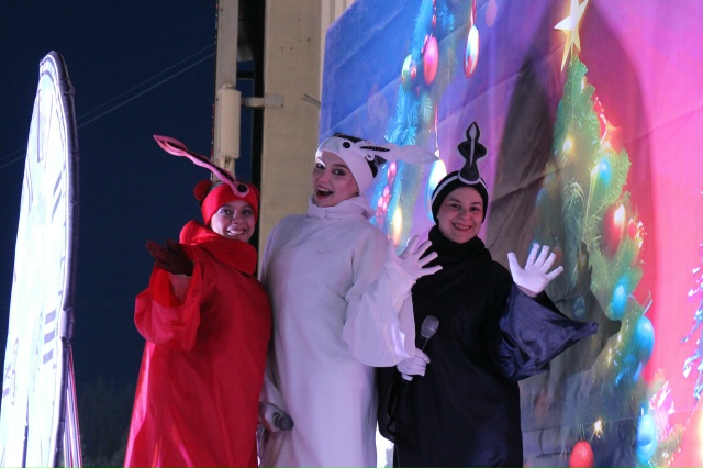 На сцене, словно настоящие богатыри, величественный Дед Мороз, зимний чародей Морозко и Глава города Оленегорска Сергей Пашинский вместе с маленькими и взрослыми оленегорцами говорят заветные слова и...огни на ёлке ярко вспыхивают!