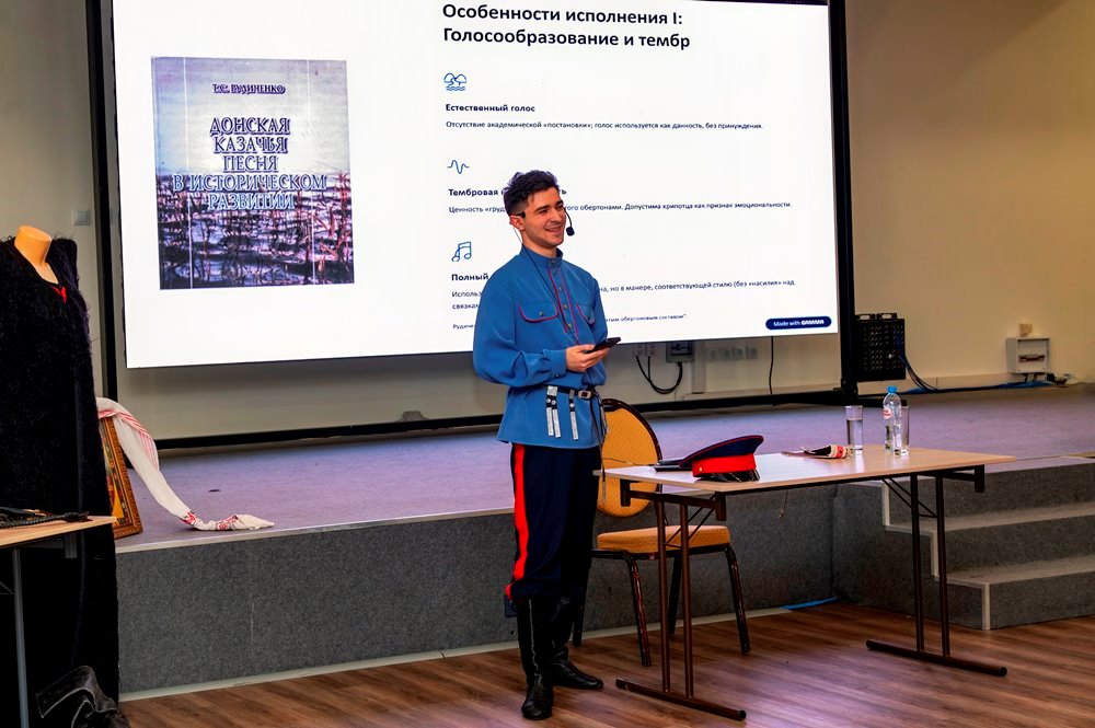 Хормейстер народного самодеятельного коллектива ансамбля казачьей песни «Северная станица», этномузыколог, Даниил Ражабаевич Мадаминов провёл интересное лекционно-практическое занятие о казачьей песне. Для участников творческой лаборатории народный самодеятельный коллектив ансамбль казачьей песни «Северная станица» показал несколько фрагментов обряда казачьей свадьбы.