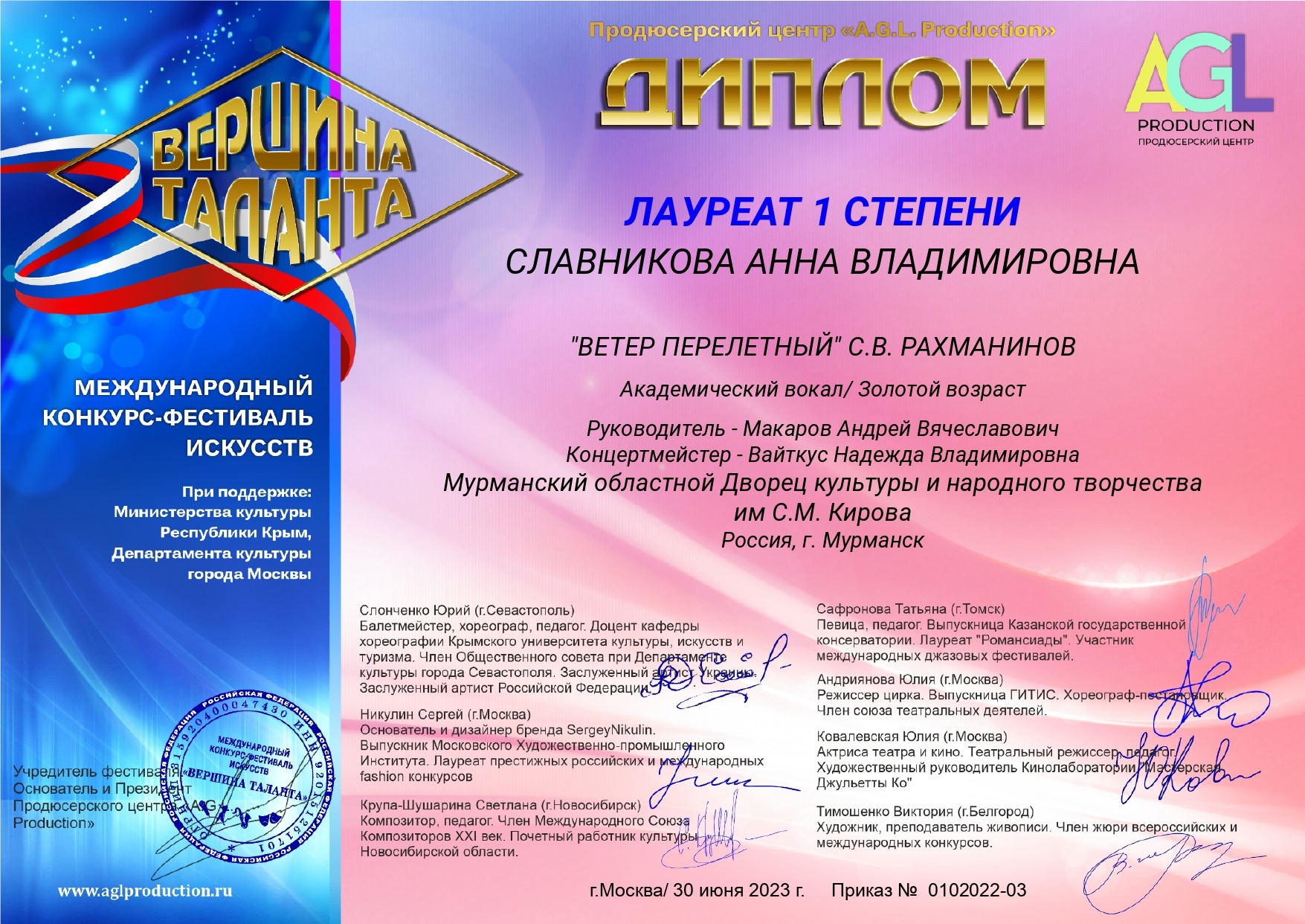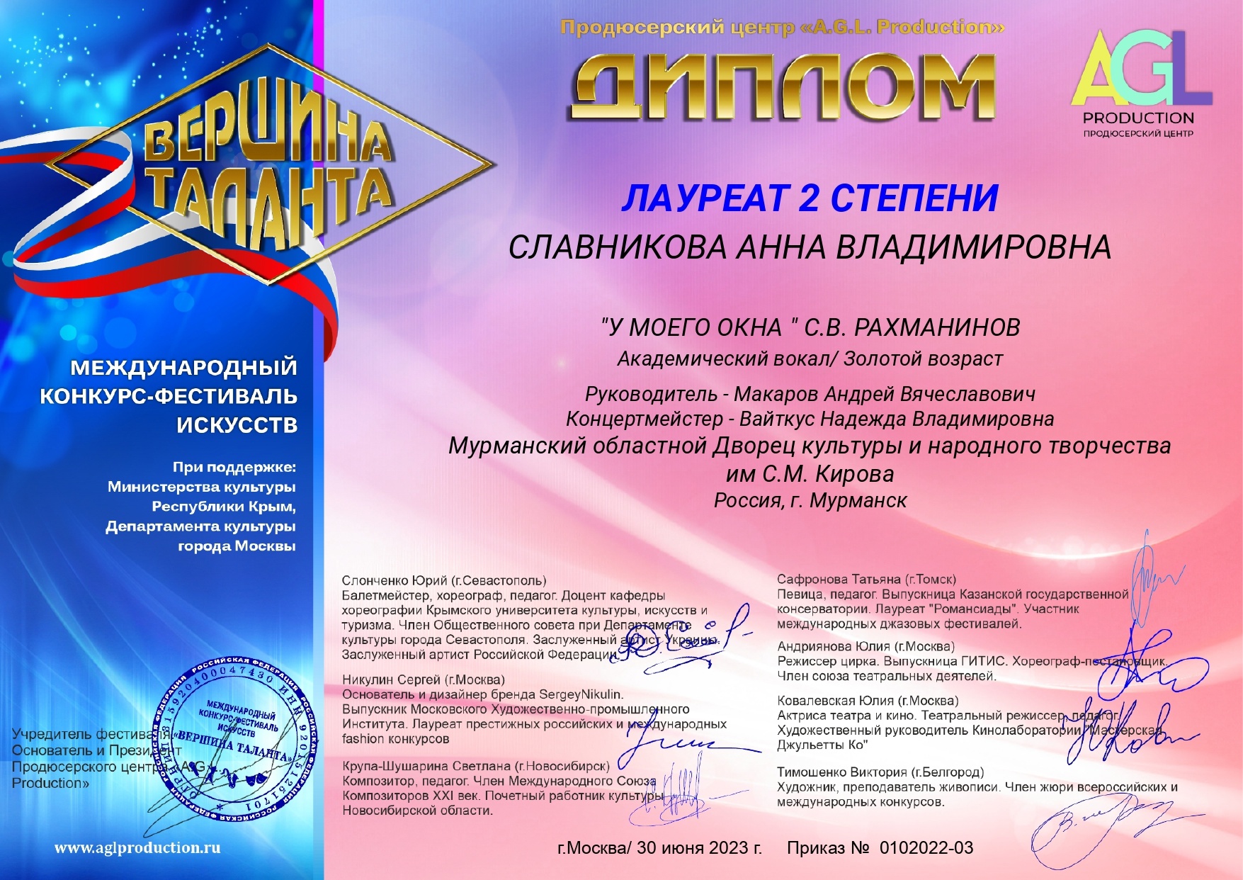 В июне 2023 года в Москве при поддержке Министерства культуры Республики Крым, Департамента культуры г. Москвы состоялся международный конкурс-фестиваль искусств «Вершина таланта». Творческое состязание проходило в дистанционном формате. Сотни участников и творческих коллективов из России и ближнего зарубежья представили видеозаписи конкурсных выступлений на суд авторитетного жюри. 30 июня членами жюри были подведены итоги. В номинации «Академический вокал» солистка ансамбля «Орфей» Анна Славникова стала Лауреатом I степени, исполнив романс С. В. Рахманинова «Ветер перелетный», а исполнение романса «У моего окна» отмечено дипломом Лауреата II степени. Руководителю коллектива Андрею Макарову вручена Благодарность оргкомитета конкурса «за преданность искусству, вклад в развитие творческих способностей своих воспитанников и достойное представление своего региона». Поздравляем с отличным результатом и желаем новых побед и творческих успехов!