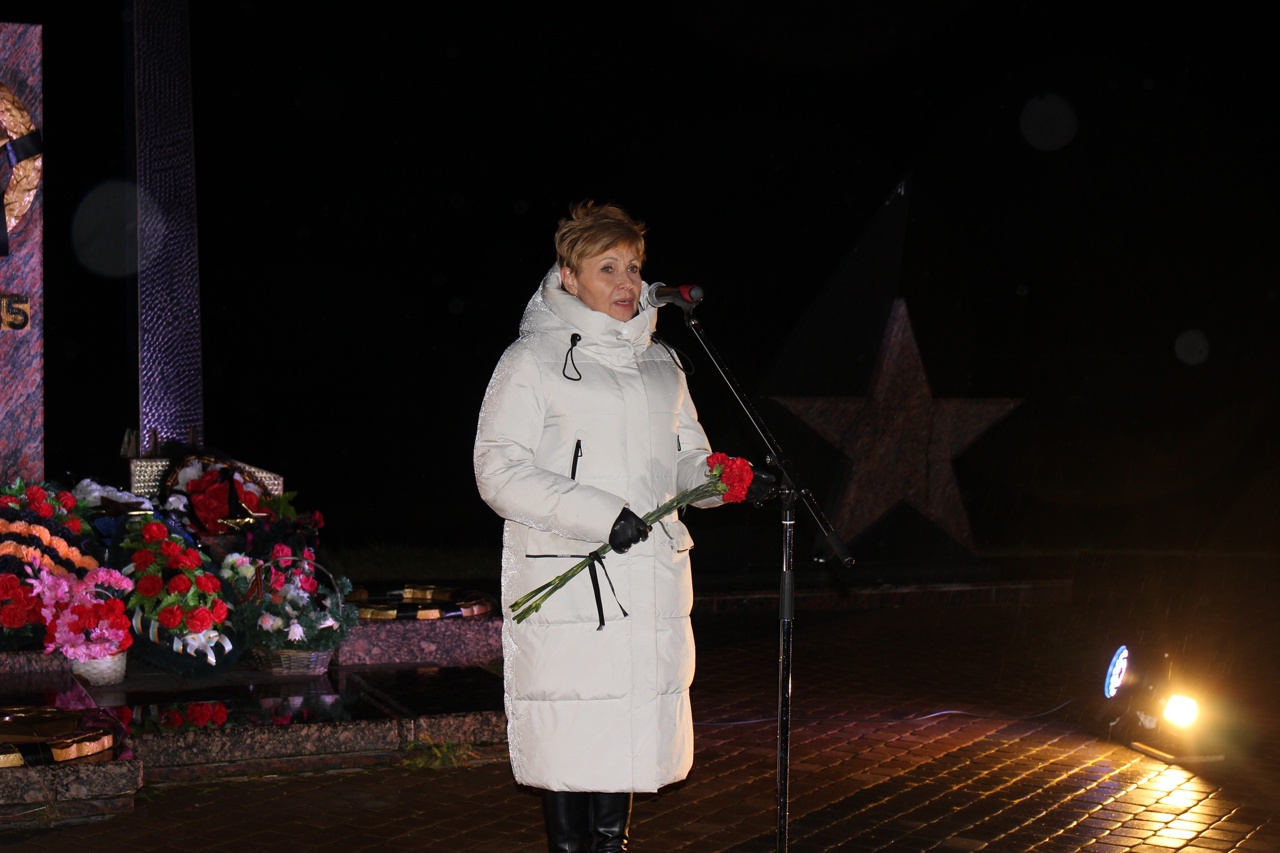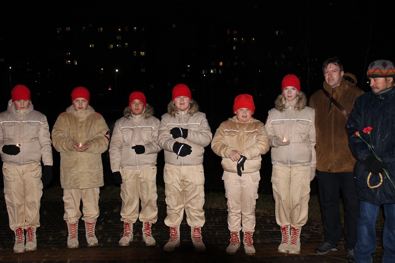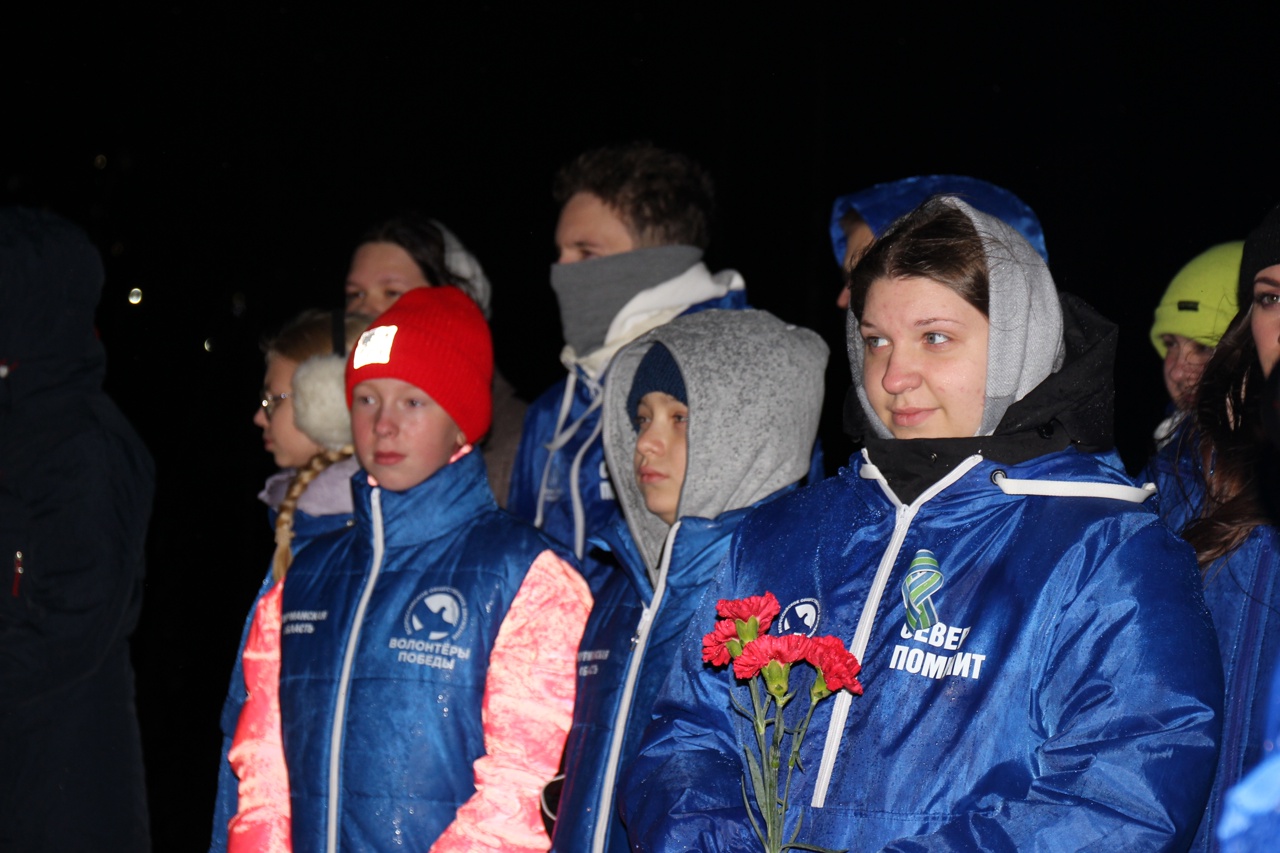 Многие оленегорцы самого разного возраста пришли почтить память и возложить цветы к Мемориалу. Вместе с ведущей, сотрудником досугового отдела, Зоряной Дуб участники мероприятия воздали почести всем защитникам Заполярья. В память о великом подвиге нашего народа в руках у людей сияли свечи, как символ каждой отданной за Победу жизни.