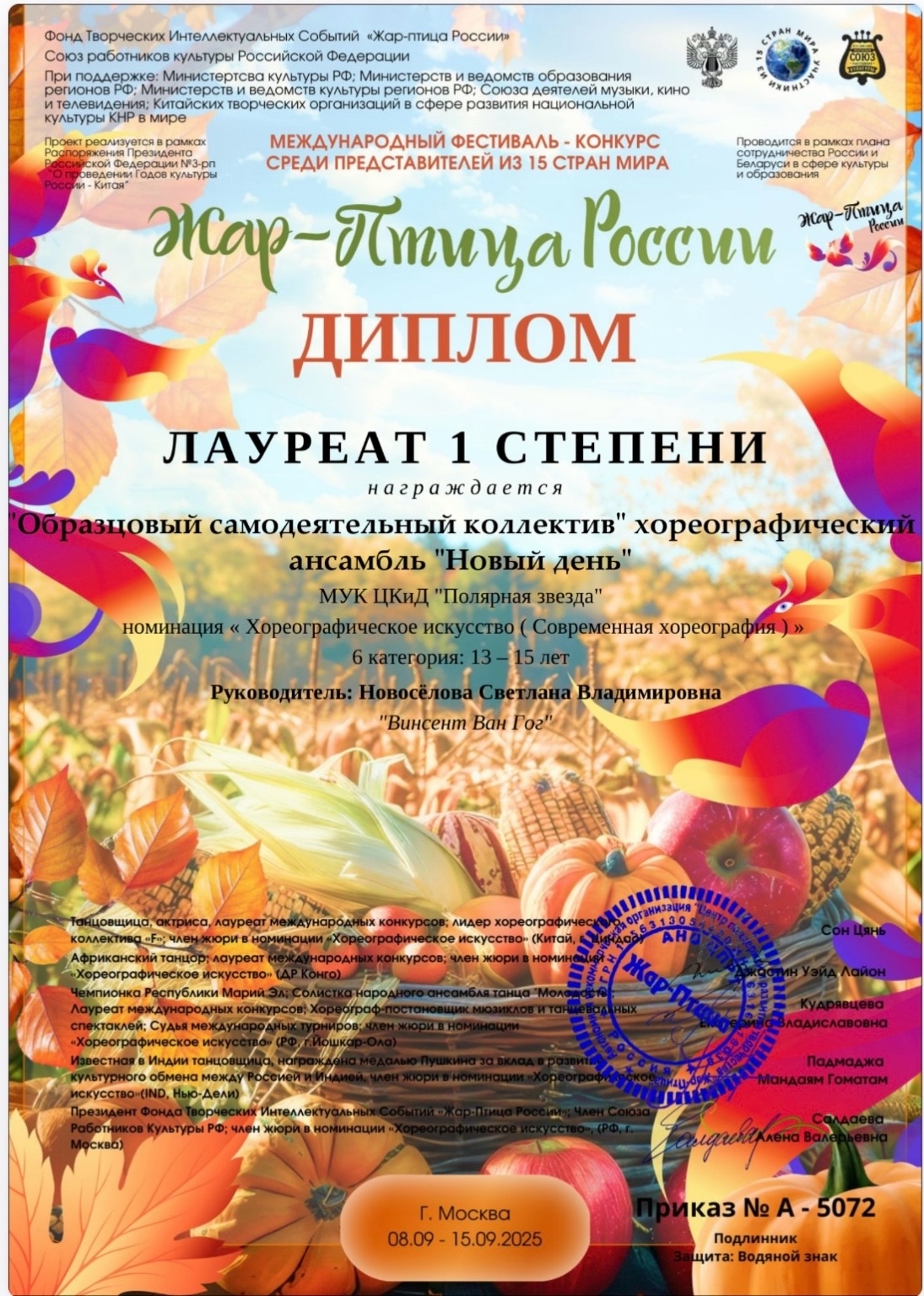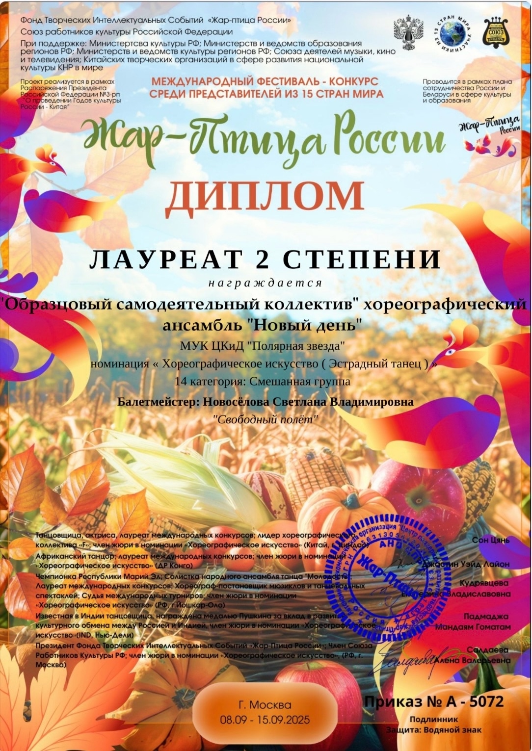Международный Фестиваль-Конкурс среди представителей из 15 стран мира "Жар -Птица России! " впечатляет множеством наград! Участники из Образцового самодеятельного коллектива хореографический ансамбль «Новый день», под руководством Светланы Новосёловой уже второй год подряд своим профессионализмом заставляют жюри делать выбор в их пользу!