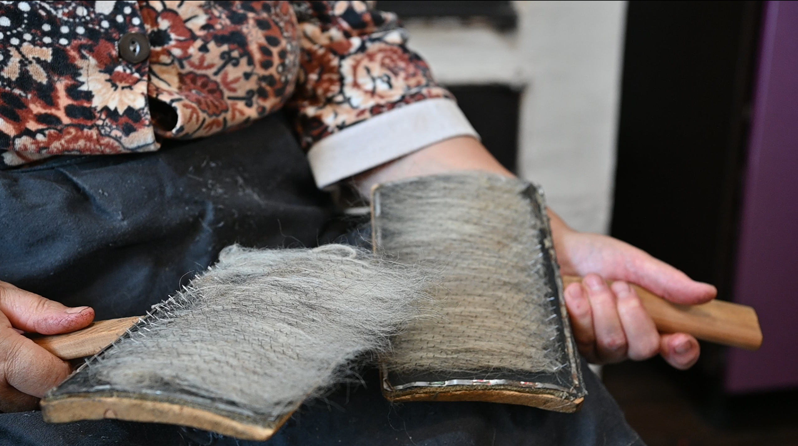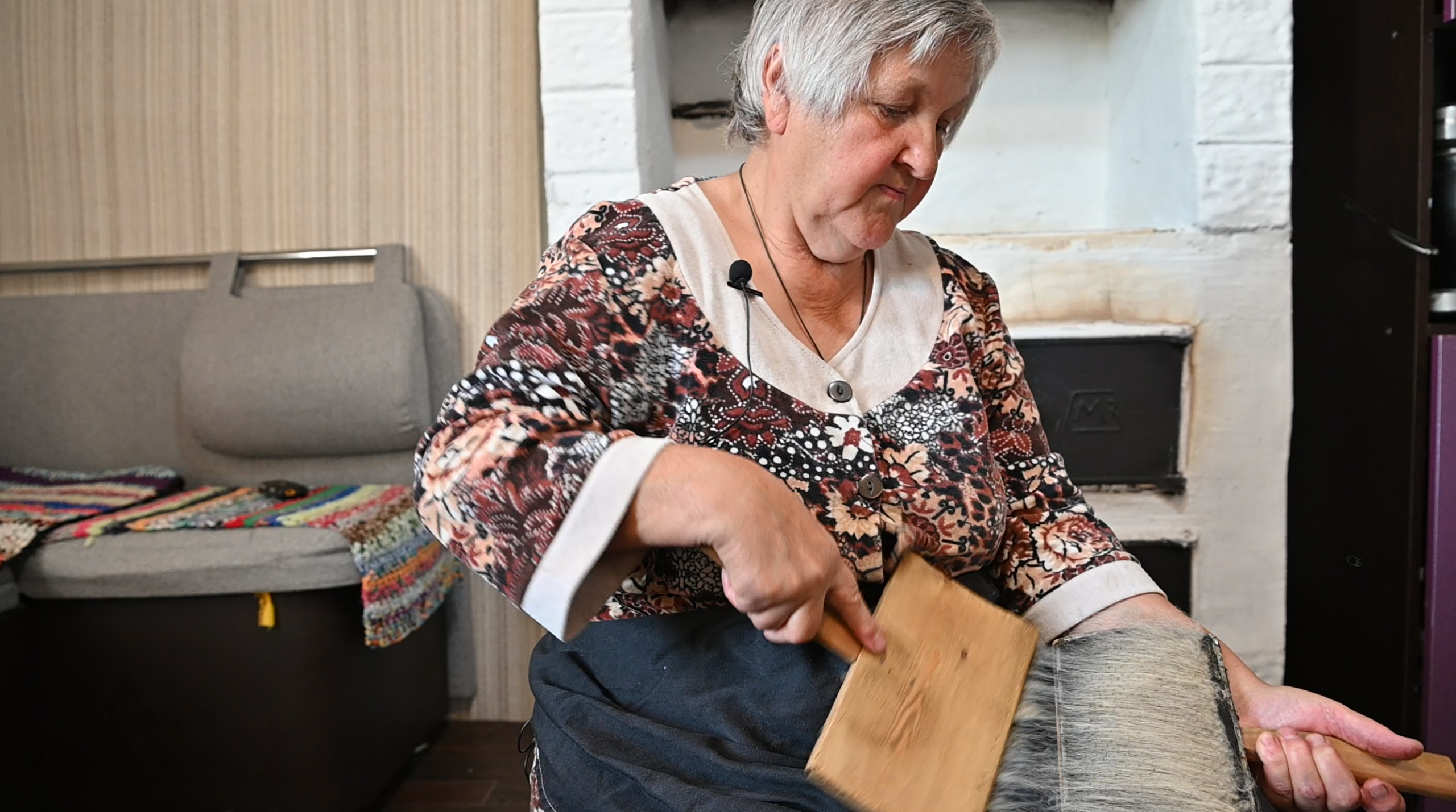 DSC_7016, DSC_7017. Конева Марина Арсеньевна демонстрирует техники обработки шерсти (чесание). с.Варзуга. Фото Д.И.Вайман. 23.09.2024. Архив Института гуманитарных исследований УрО РАН.