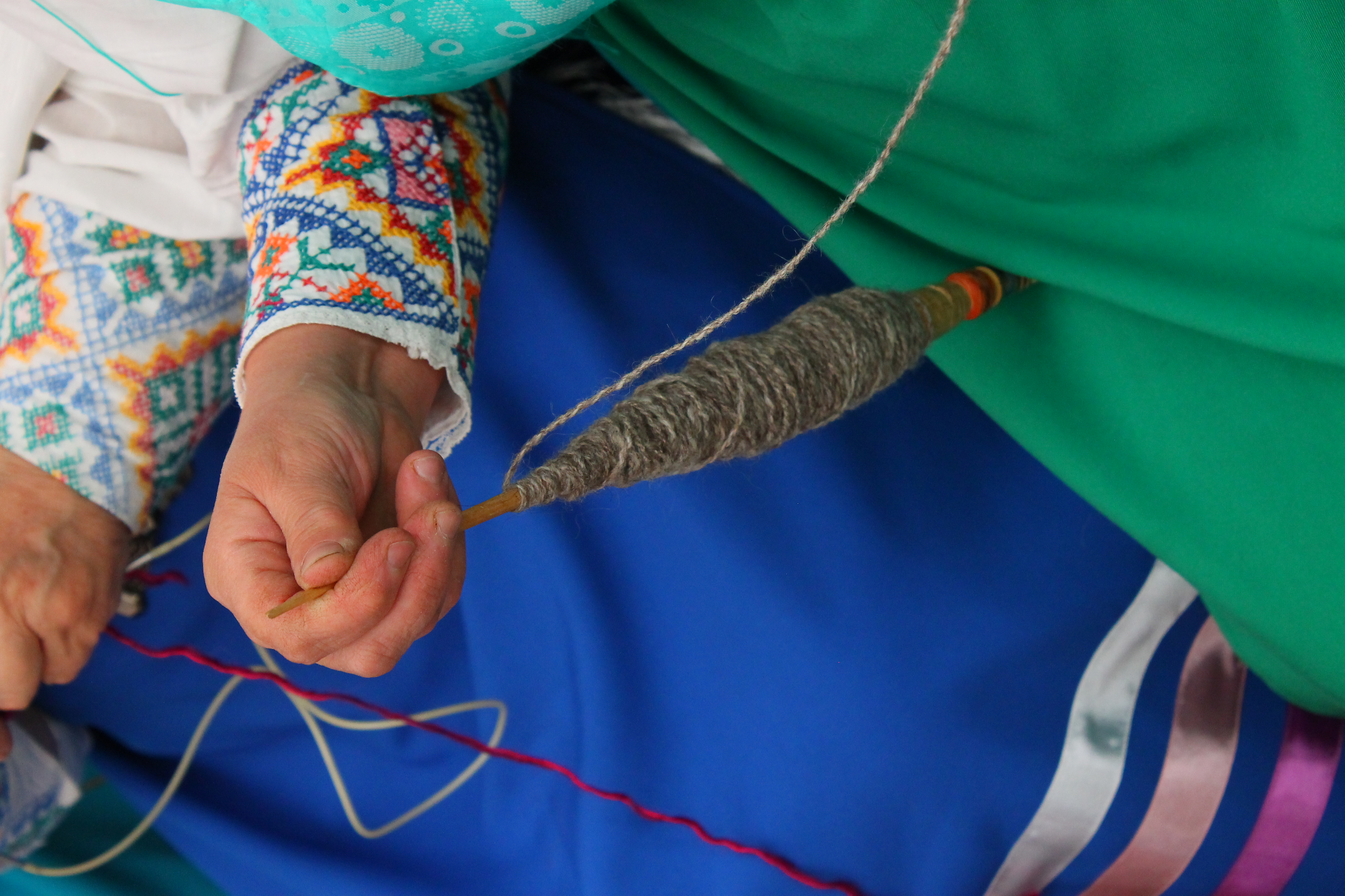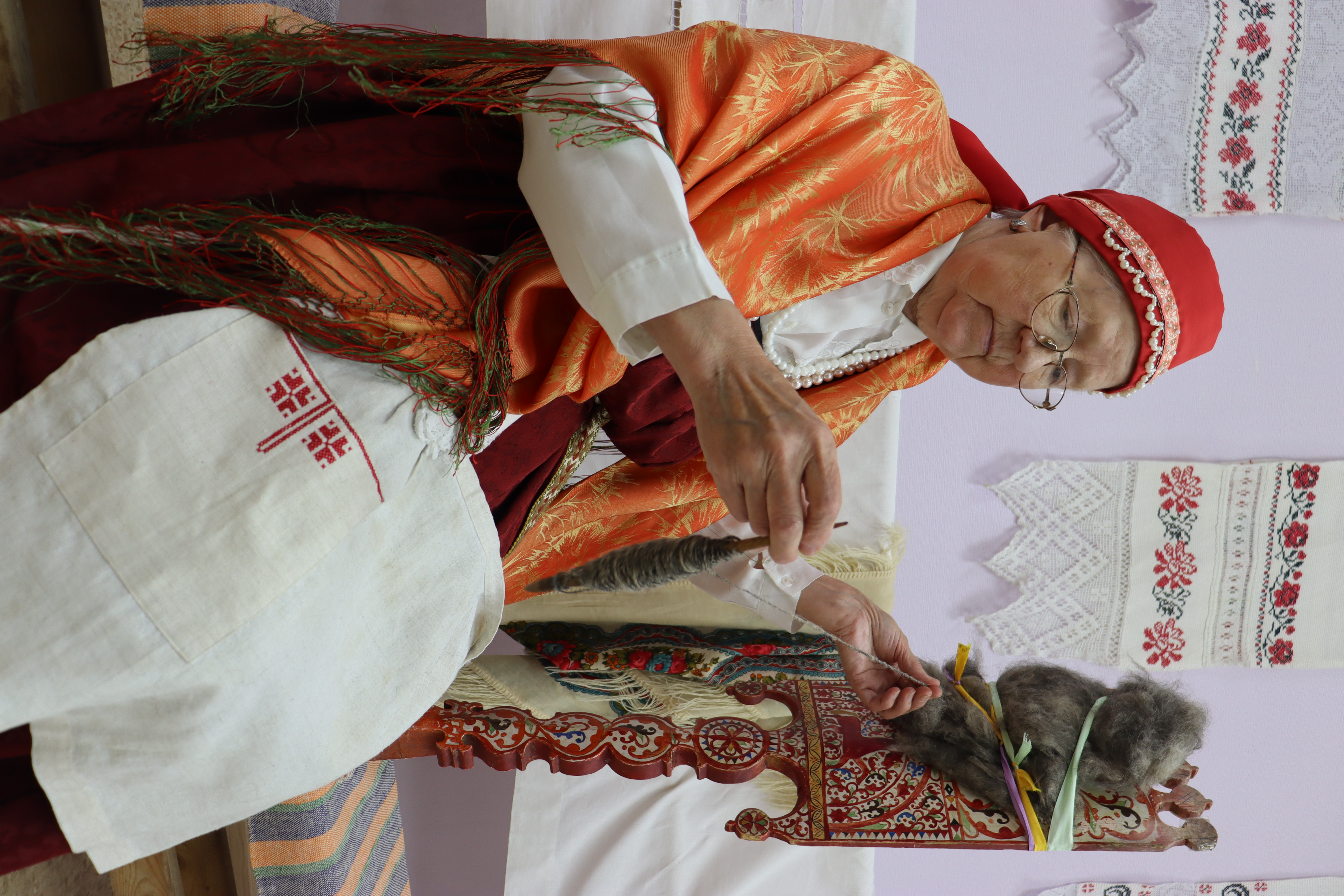 IMG_5731. Мищук Надежда Николаевна демонстрирует техники обработки шерсти (прядение). пос.Зеленоборский. Фото Ю.С.Чернышева. 22.09.2024. Архив Института гуманитарных исследований УрО РАН.