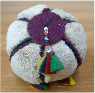 Лепестки, из которых изготавливался мяч – паалл украшали узором, выжженным проволокой, нагретой на огне или мягким узором из набора ромбов, крестов, точек, который располагали строго симметрично.