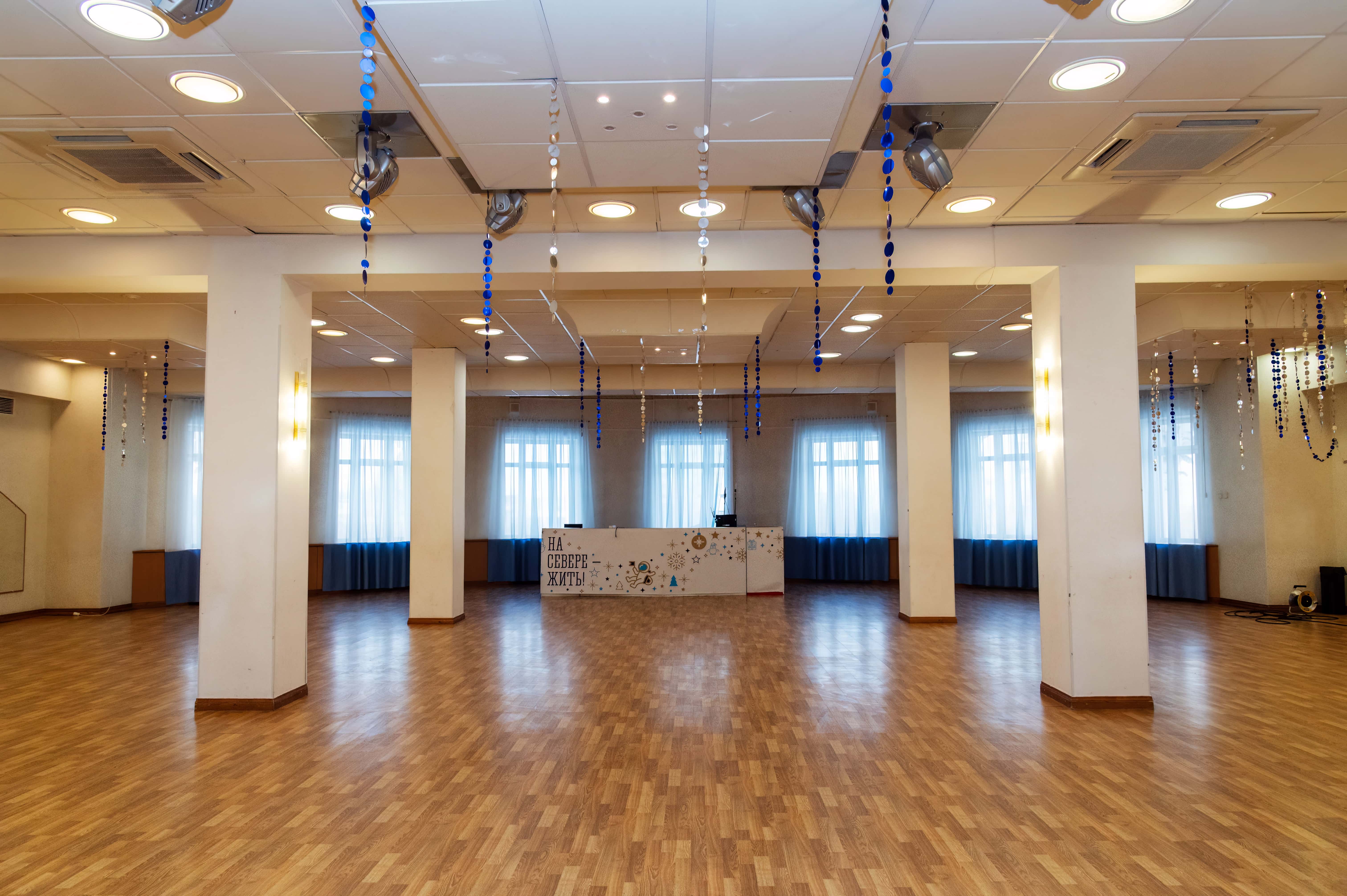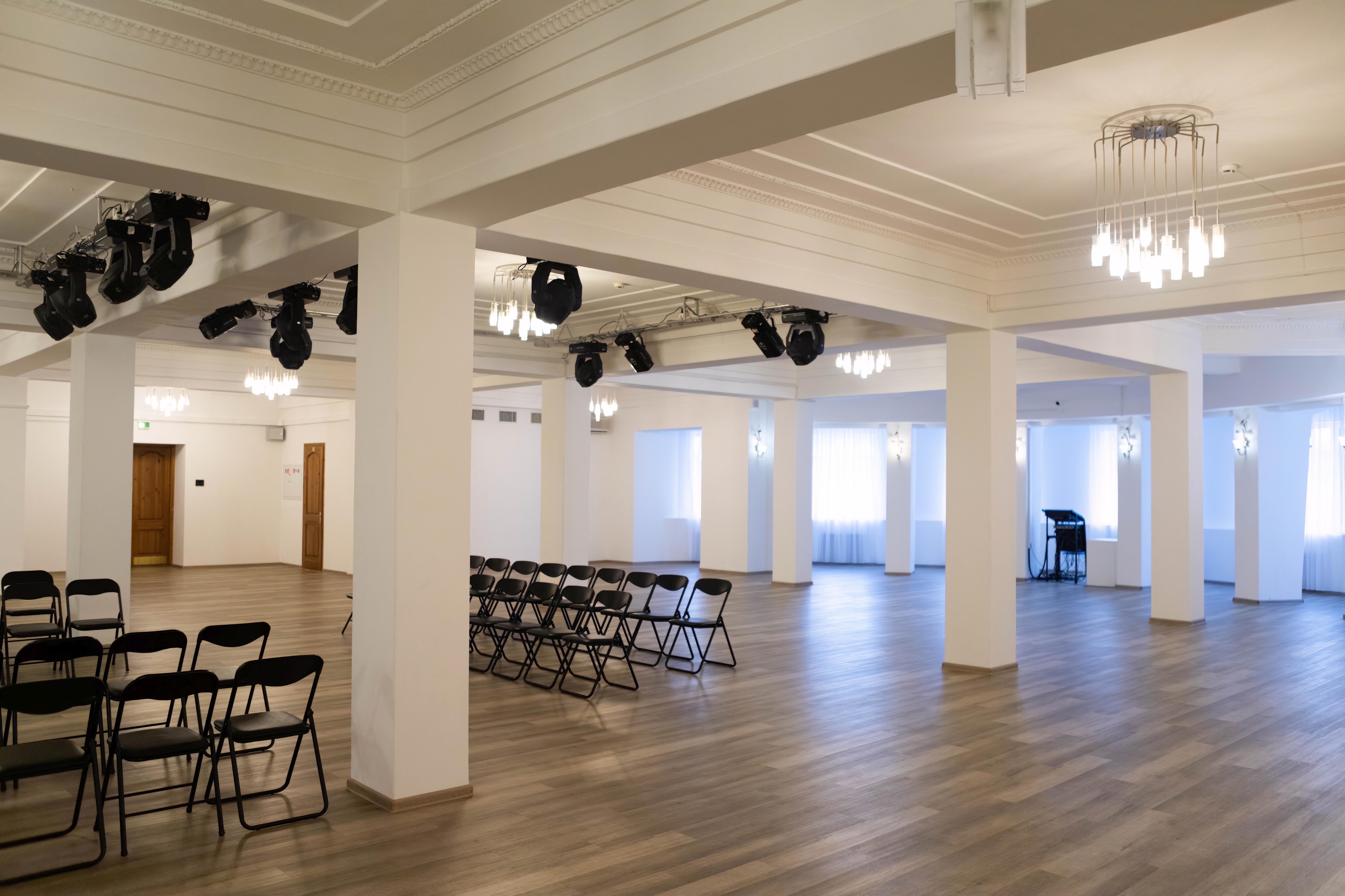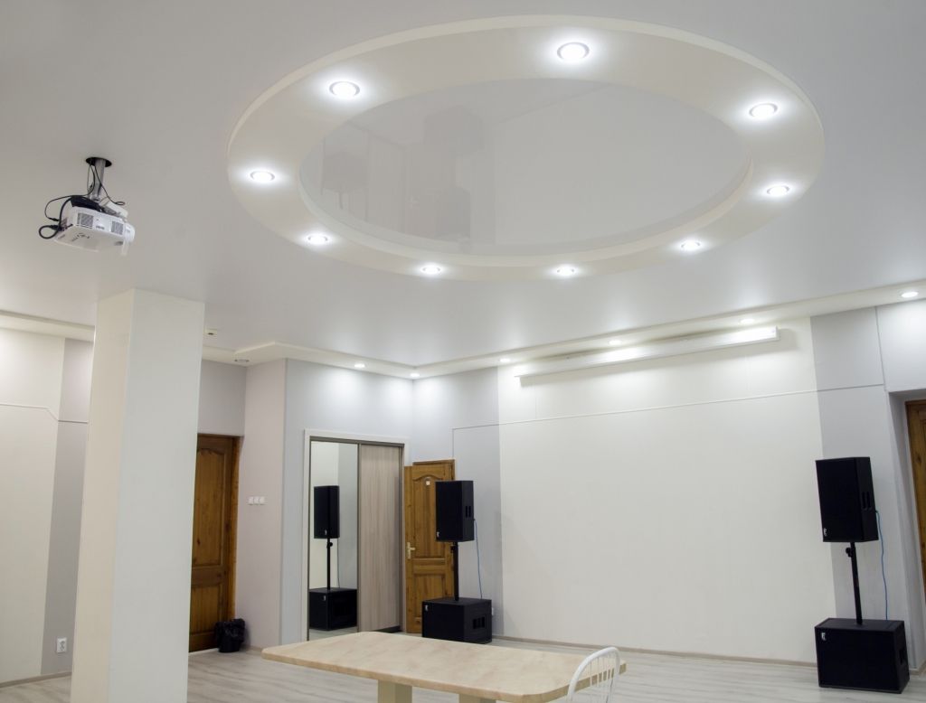 Световые приборы, встроенные в архитектуру зала в подвесной потолок, поделенный на 2 зоны освещения.
