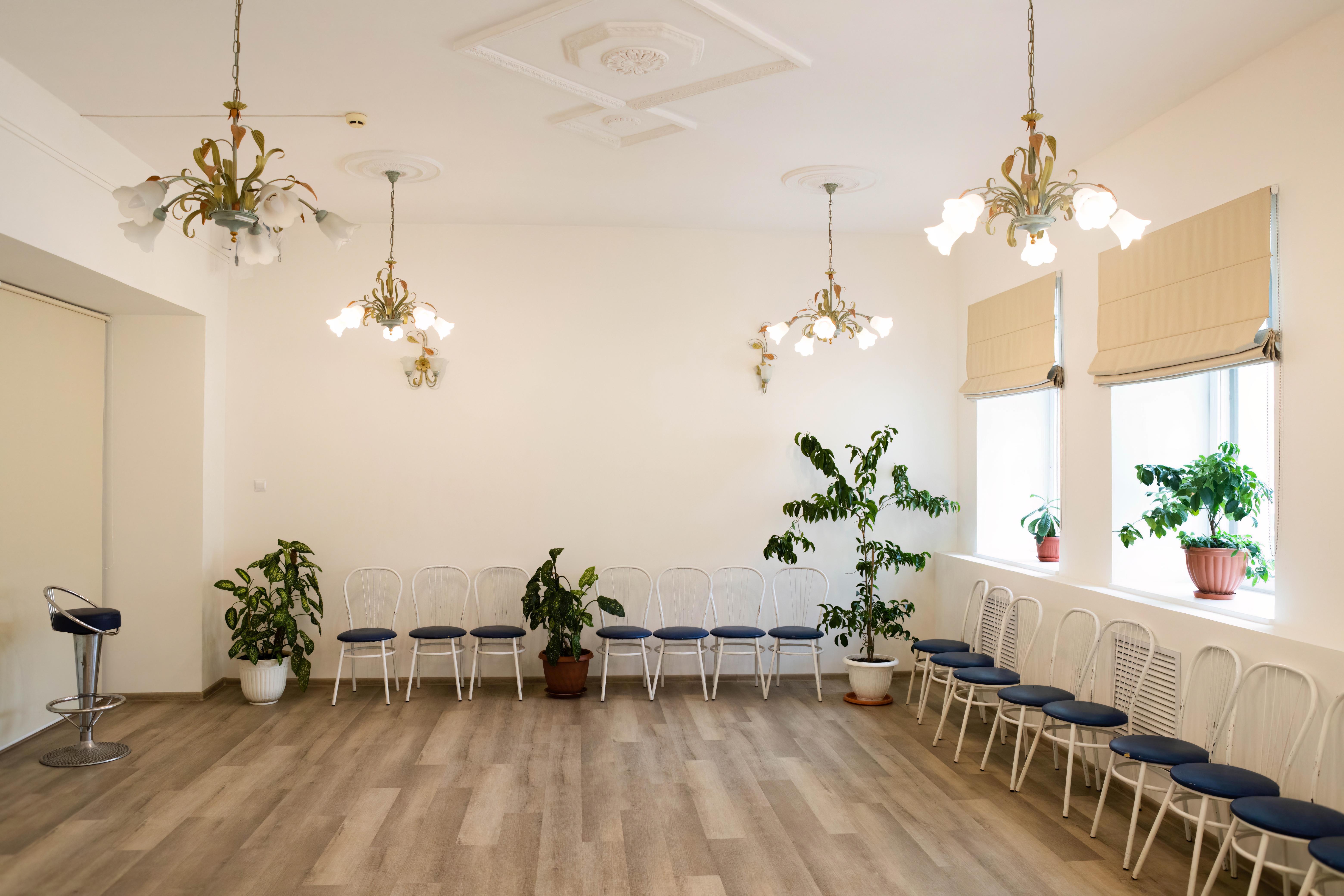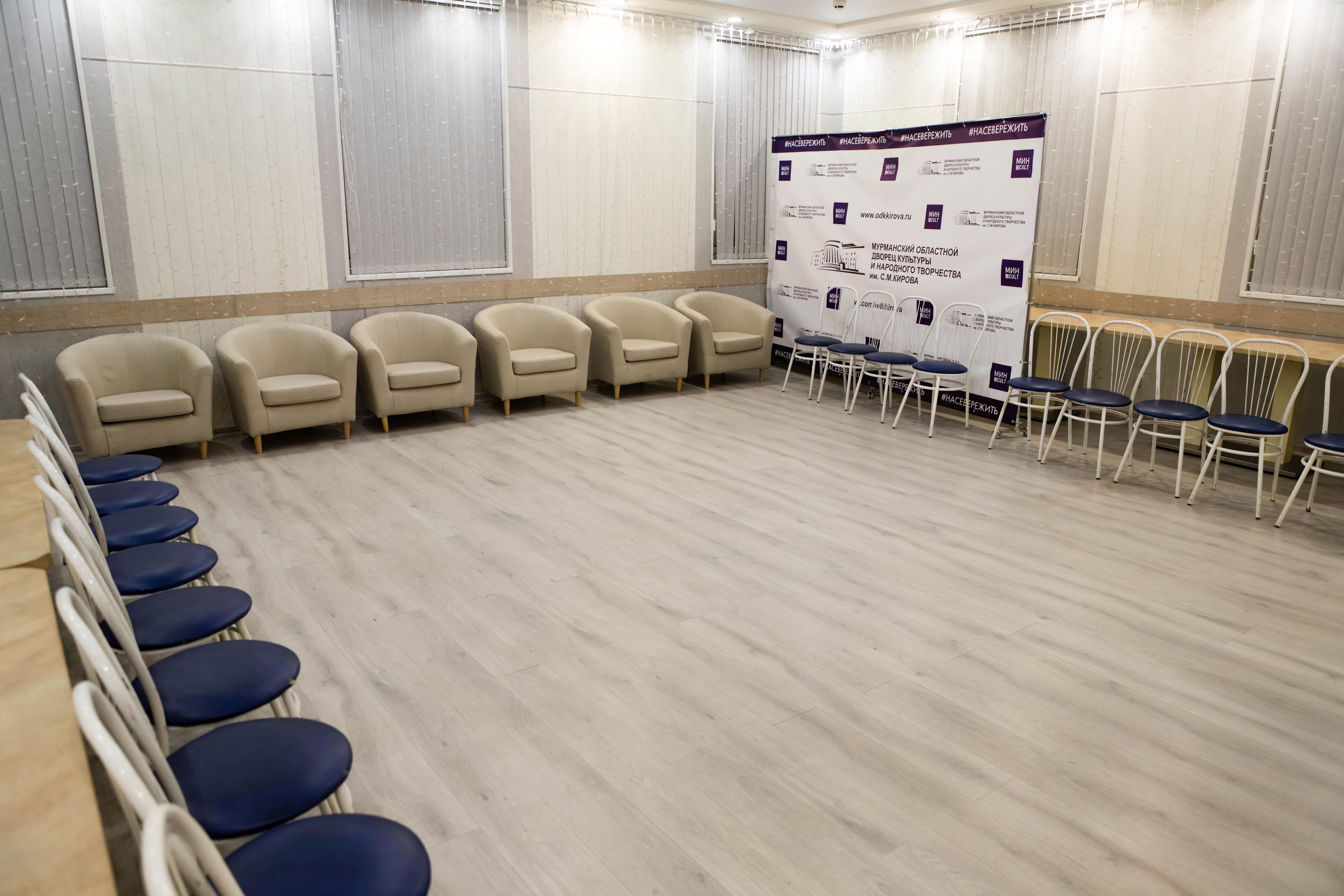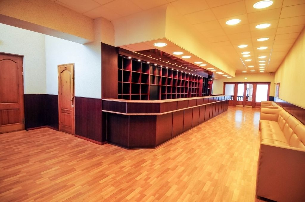 Световые приборы, встроенные в архитектуру зала в подвесной потолок, поделенный на 2 зоны освещения.